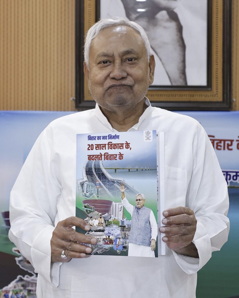 पटना : मुख्यमंत्री नीतीश कुमार ने 1, अण्णे मार्ग स्थित ‘संकल्प’ में ‘बिहार का नवनिर्माण 20 साल विकास के, बदलते बिहार के’ का लोकार्पण किया।