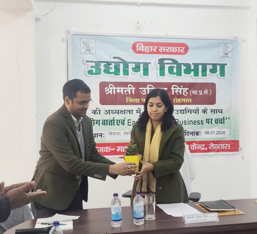रोहतास की जिलाधिकारी श्रीमती उदिता सिंह की अध्यक्षता में गुरुवार को बियाडा डेहरी के सुधा डेयरी कैंपस के सभागार में “उद्योग वार्ता” की बैठक आयोजित की गई। बैठक में जिलाधिकारी श्रीमती उदिता सिंह ने बियाडा में स्थित सभी उद्यमियों से बारी-बारी से उनकी समस्याओं को सुना एवं उसके निदान को लेकर संबंधित अधिकारियों को निर्देश दिया। बैठक में कुछ उद्यमियों द्वारा वियाडा जमीन को बैंक में र्मोगेज की समस्या को उठाया। इस पर जिलाधिकारी ने बैंकों को निर्देश दिया कि वे बियाडा के उप महाप्रबंधक से एनओसी प्राप्त कर उद्यमियों को सुलभता से ऋण मुहैया कराना सुनिश्चित करें। बैठक में कुछ उद्यमियों द्वारा नेटवर्क की समस्या के बारे में जानकारी दी गई। इस संबंध में जिलाधिकारी श्रीमती उदिता सिंह ने विशेष कार्य पदाधिकारी को निर्देश दिया कि वह जिले के प्रमुख टेलीकॉम कंपनी की एक बैठक बुलाएँ और इन समस्याओं को जल्द से जल्द दूर करने की दिशा में आवश्यक कार्रवाई करें।